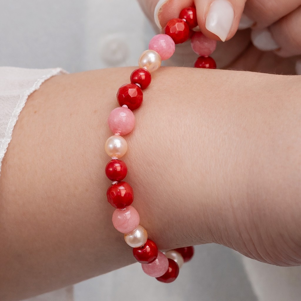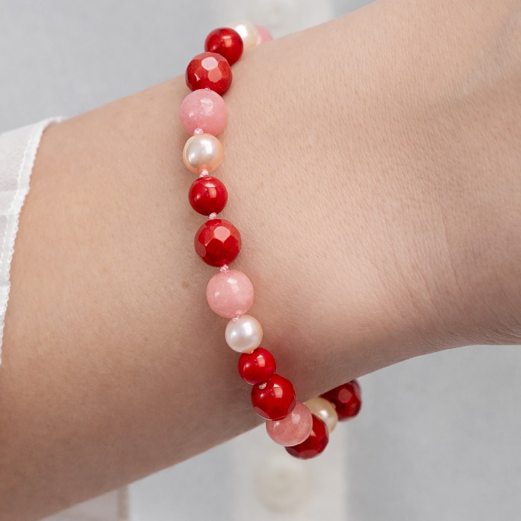 Браслет с кораллом, жемчугом, нефритом и серебром